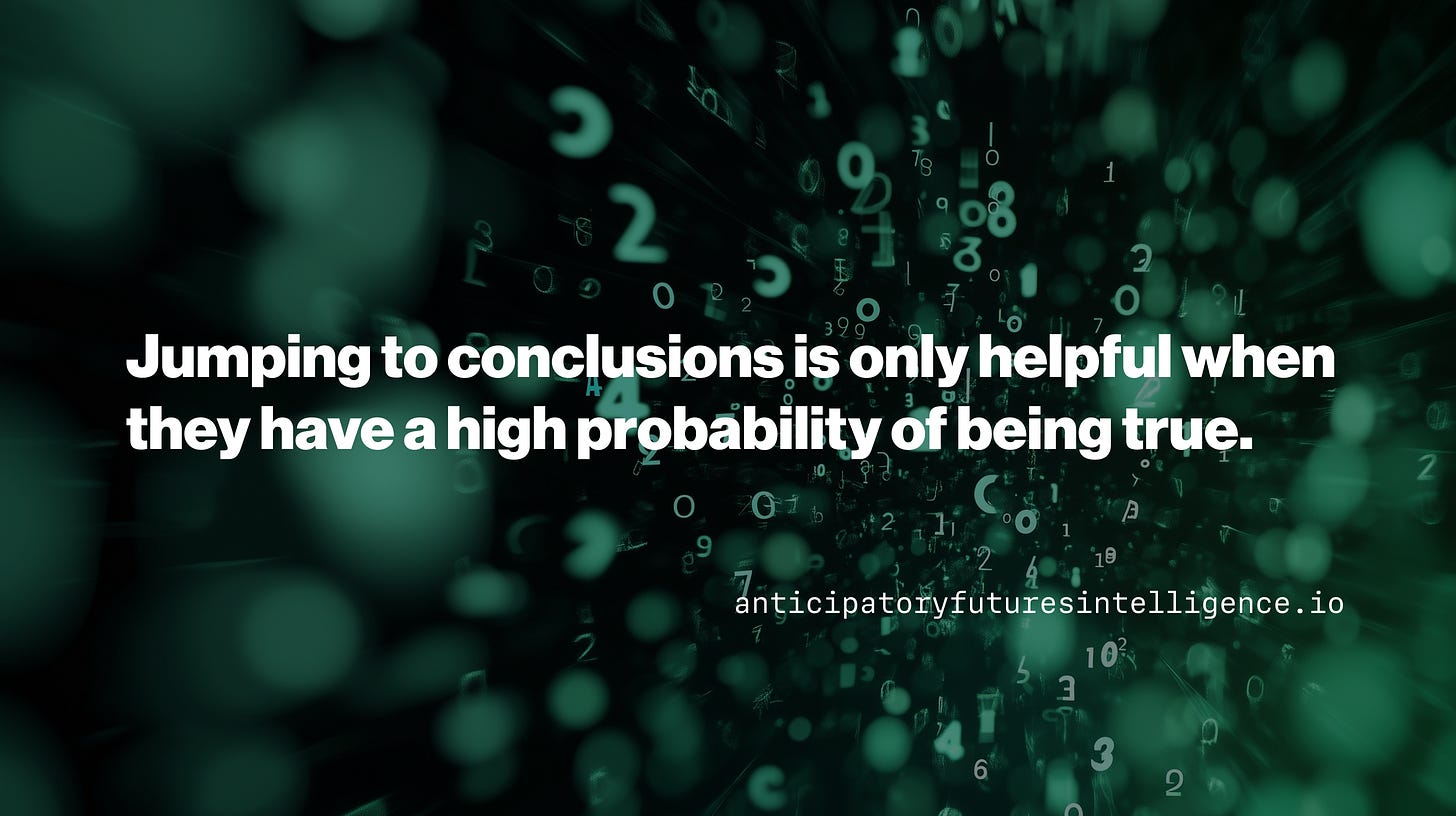 In futures scanning we typically have to make judgements and conclusions based on incomplete and contradictory information. Systems #1 Thinking helps us to notice patterns and similarities (based on past research or experience), but jumping to conclusions is only helpful when they have a high probability of being true.